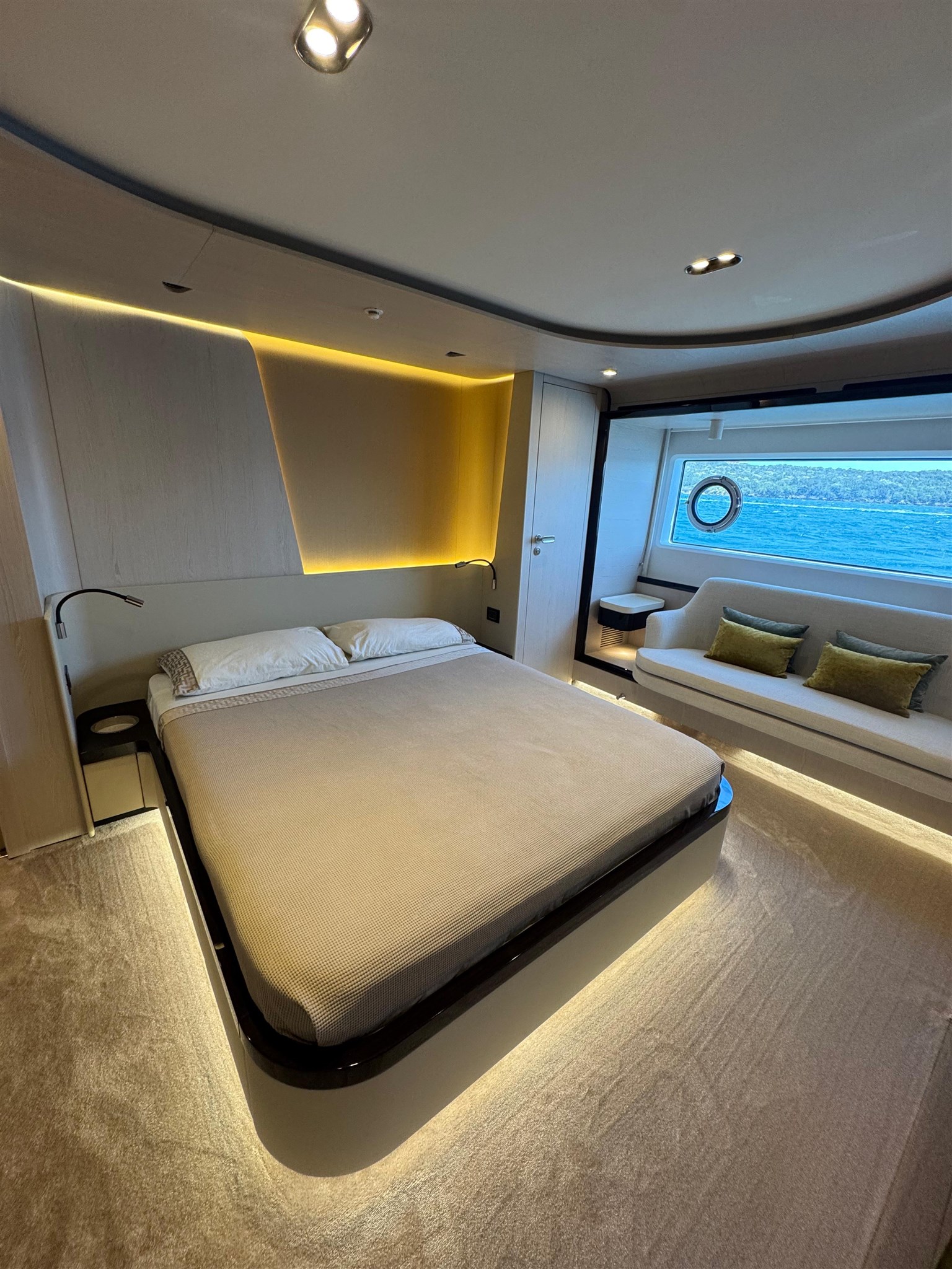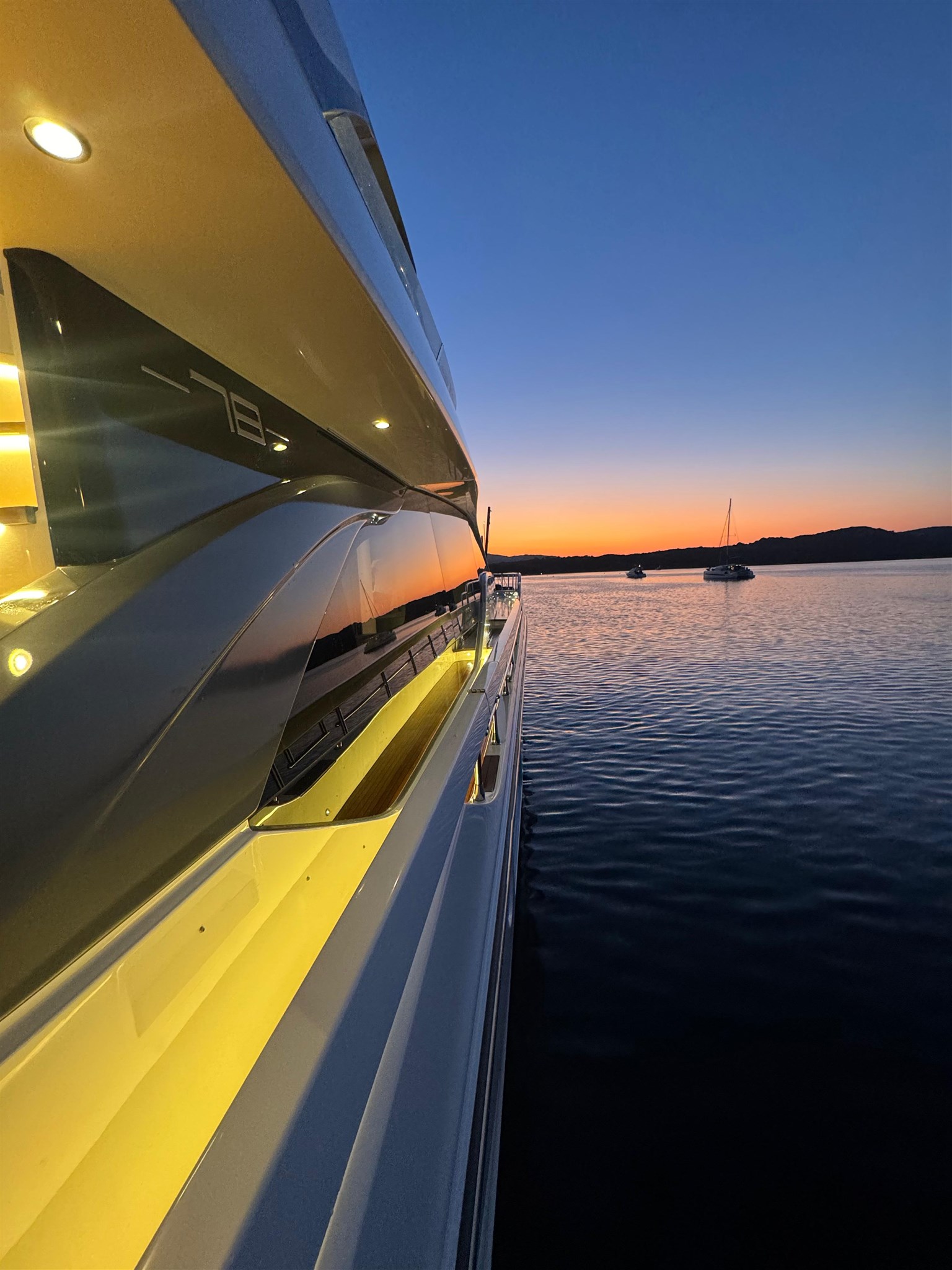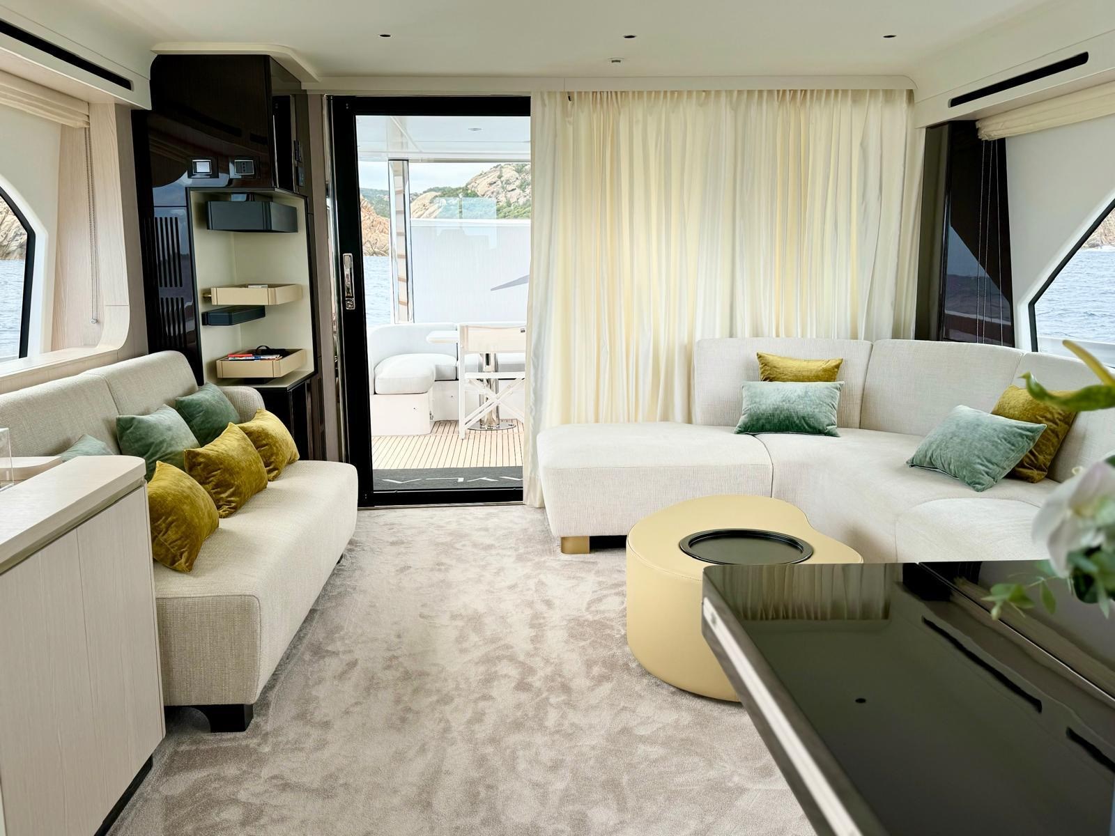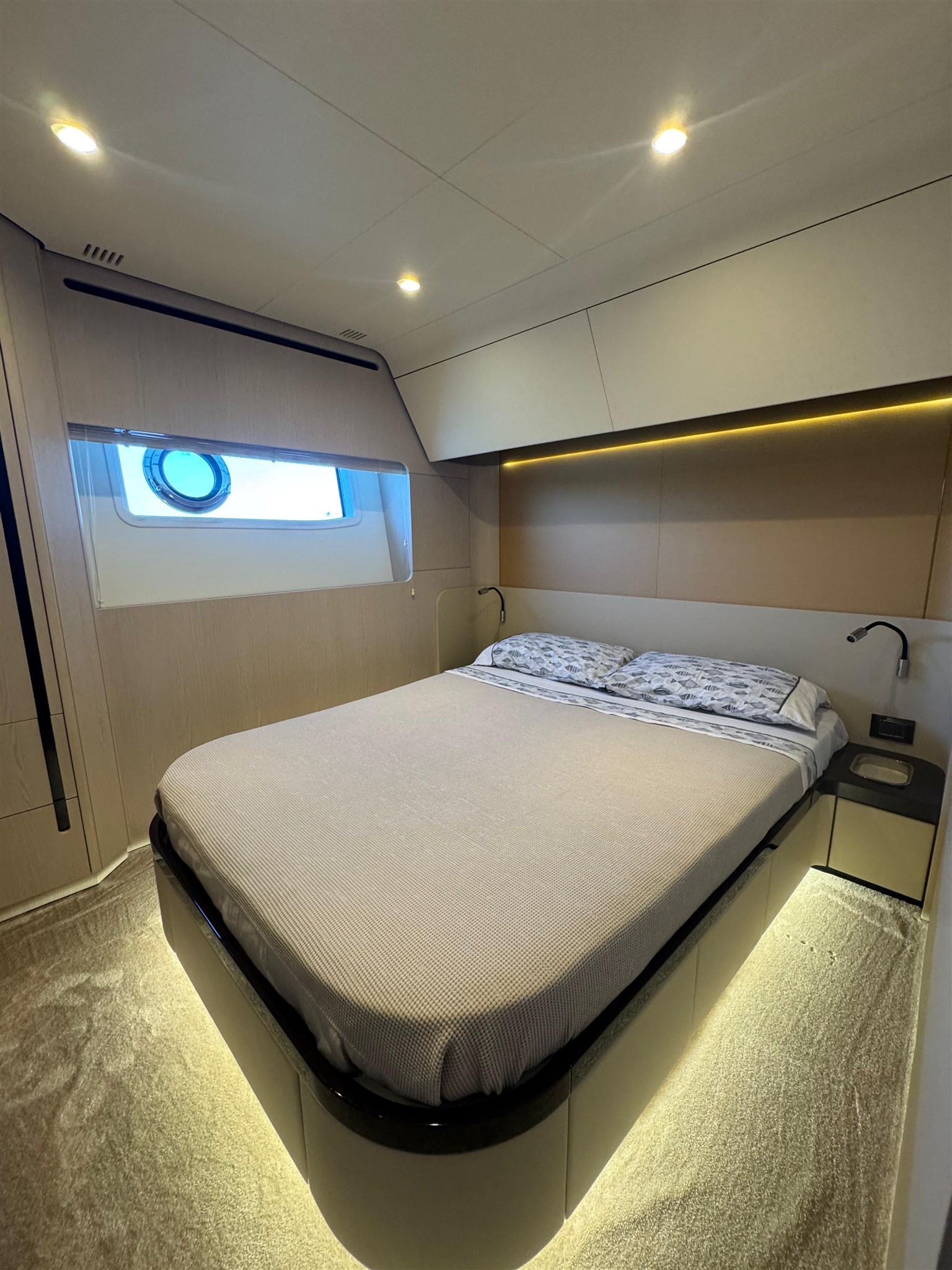 Il Fly 78, ispirato dalle atmosfere di un grande yacht, offre spazi impeccabili senza compromettere l’agilità sportiva tipica delle imbarcazioni di dimensioni inferiori. Questo yacht rappresenta una vera pioniera nel mercato nautico, grazie alla concezione intelligente delle zone di servizio. La galley e l’equipaggio ( 3 persone ) sono stati separati integralmente dal resto dell’imbarcazione, permettendo agli ospiti di godersi l’esperienza senza essere disturbati da attività dietro le quinte. Il lower deck accoglie tre cabine ospiti, di cui due Vip e una a letti gemelli, tutte con bagno ensuite. L’armatoriale, a centro barca, è a tutto baglio.