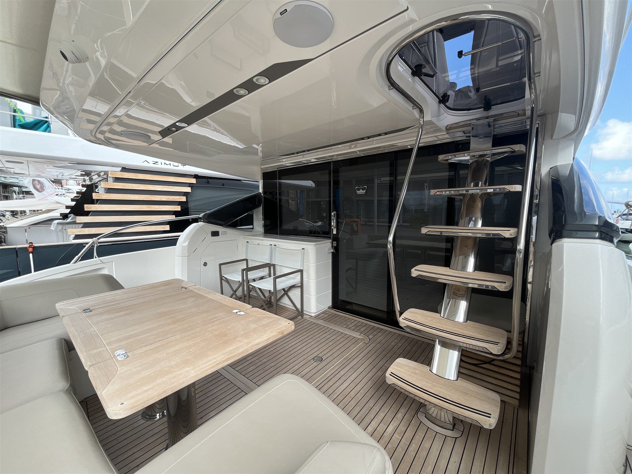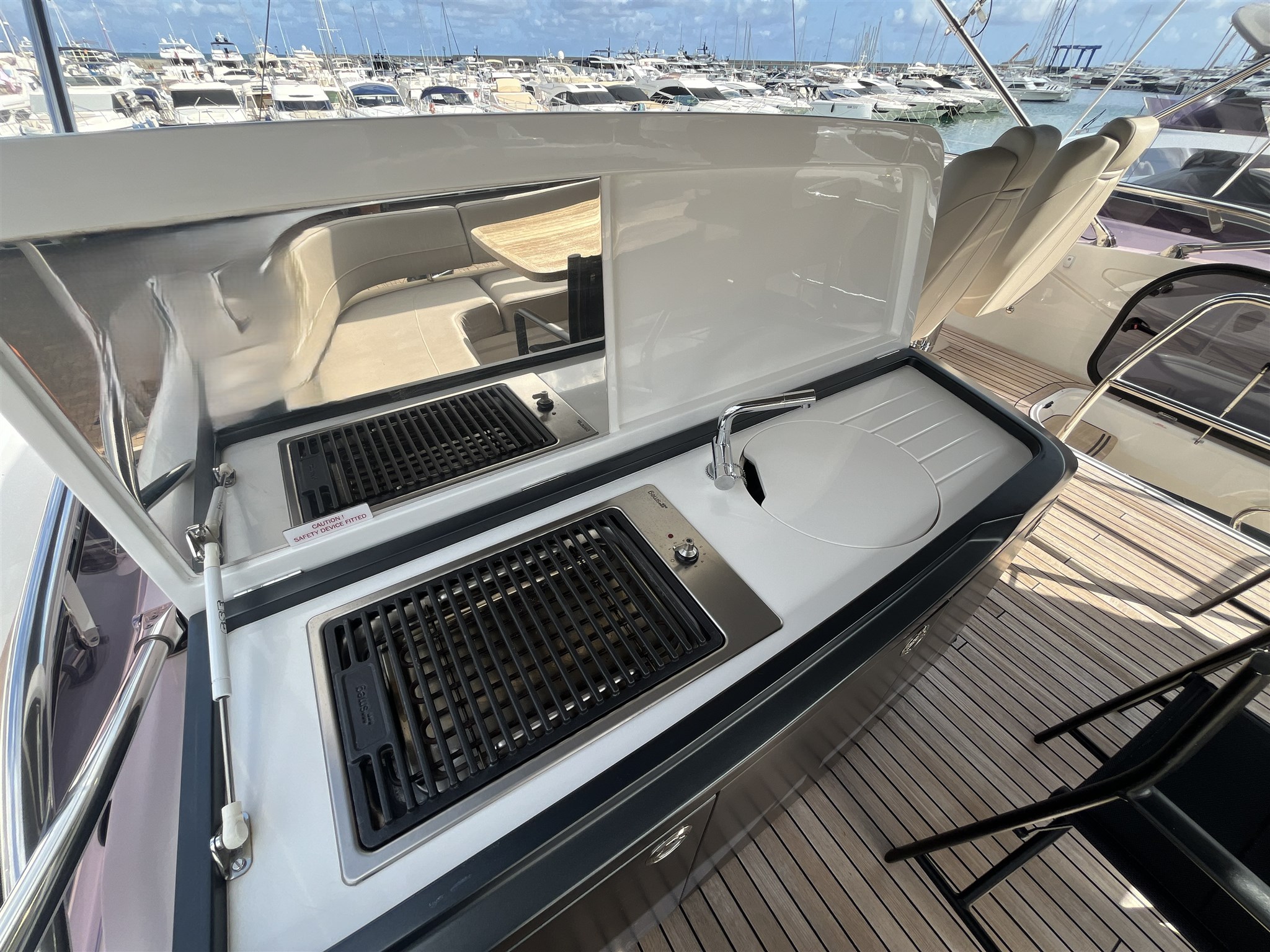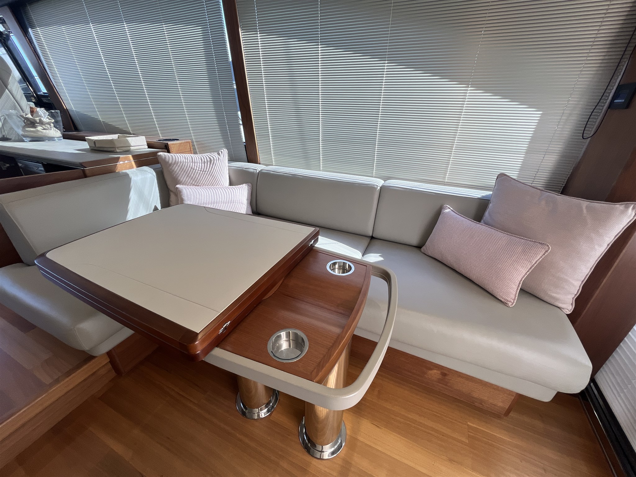 Il layout interno è stato pensato per garantire privacy e comodità, mentre l’ampio salone open space si apre su una cucina ben attrezzata e su una zona pranzo accogliente. Gli esterni includono un grande prendisole a prua, una piattaforma da bagno idraulica e un pozzetto ideale per vivere il mare in ogni momento della giornata